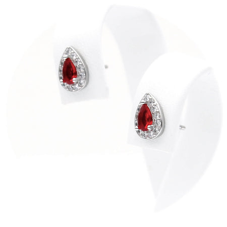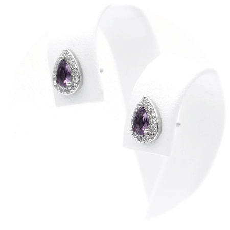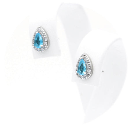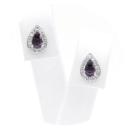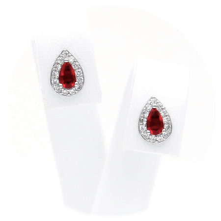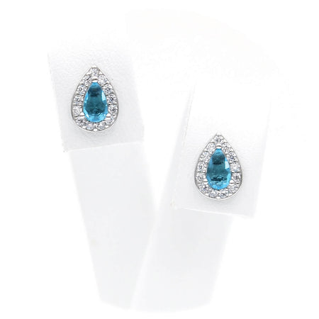 Ασημένια επιπλατινωμένα σκουλαρίκια ροζέτες σε σχήμα δάκρυ, με πράσινη κεντρική και λευκές πέτρες ζιργκόν στην περιφέρεια.