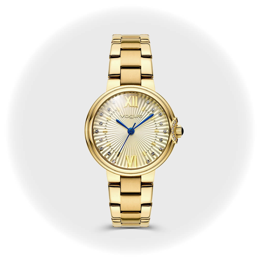 Οι λαμπερές πέτρες zircon στις ενδείξεις ώρας χαρίζουν μια διακριτική πολυτέλεια, ενώ οι ρωμαϊκοί αριθμοί στις θέσεις 12 και 6 ολοκληρώνουν τον συμμετρικό σχεδιασμό.