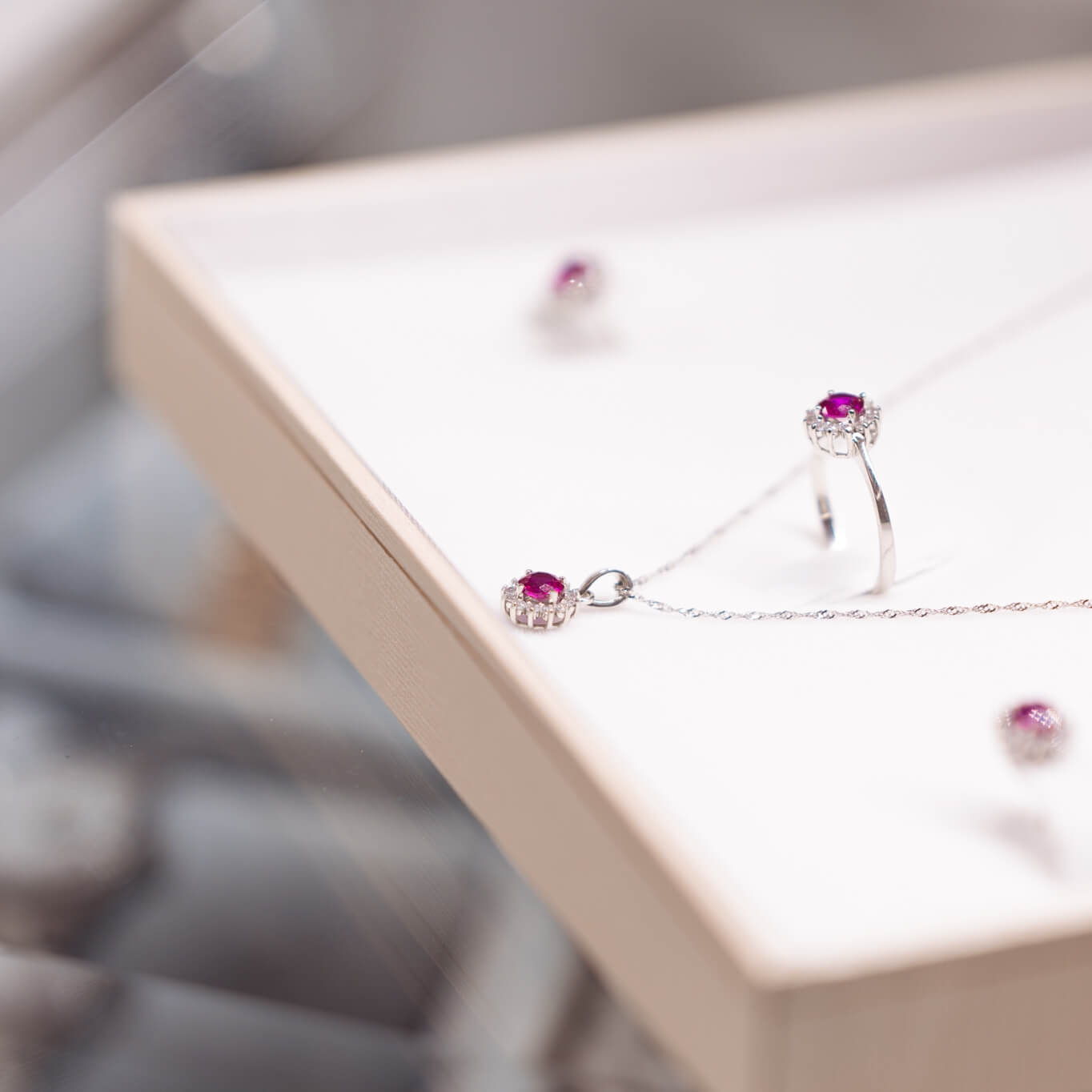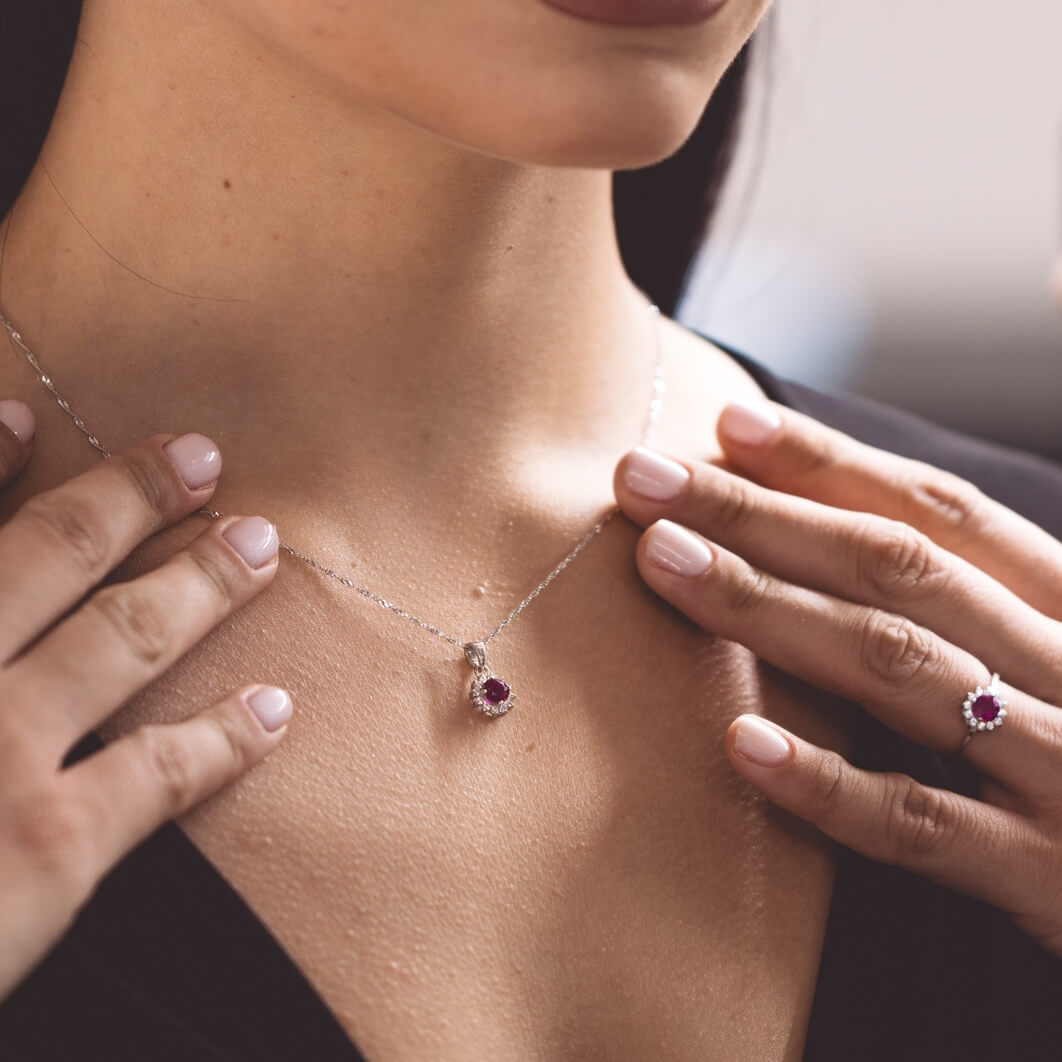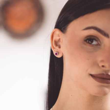 Λευκόχρυσο δαχτυλίδι 14 καρατίων ροζέτα με ματζέντα κεντρική πέτρα και περιφερειακά λευκά ζιργκόν