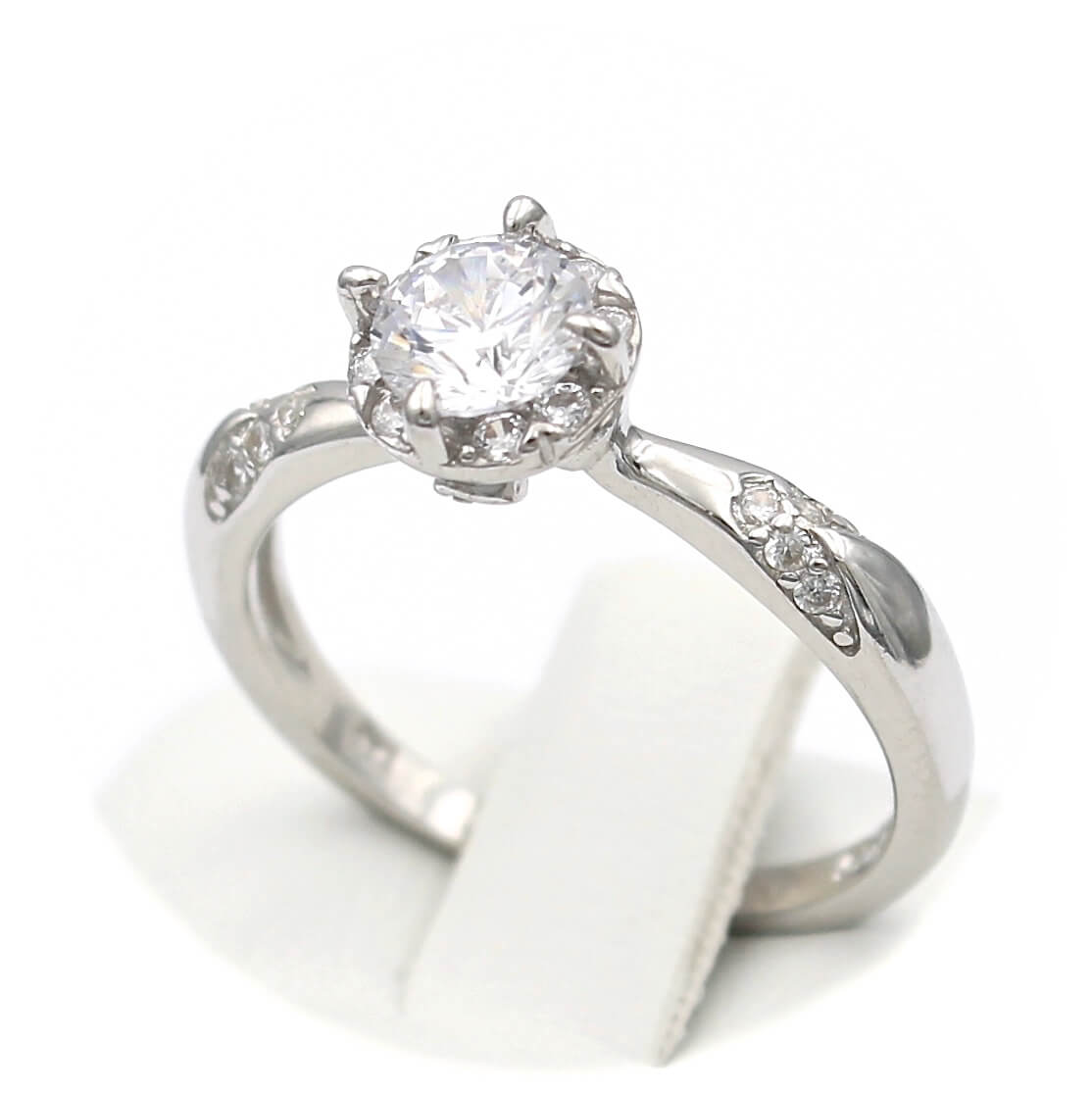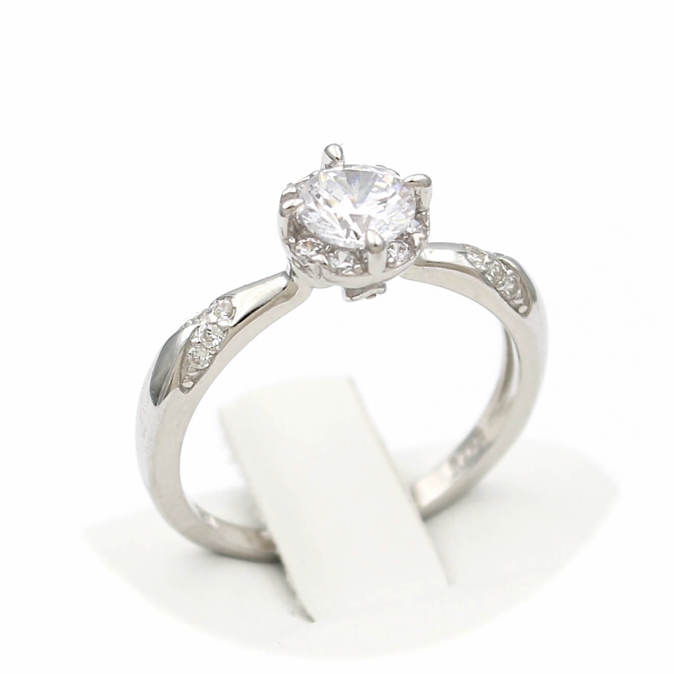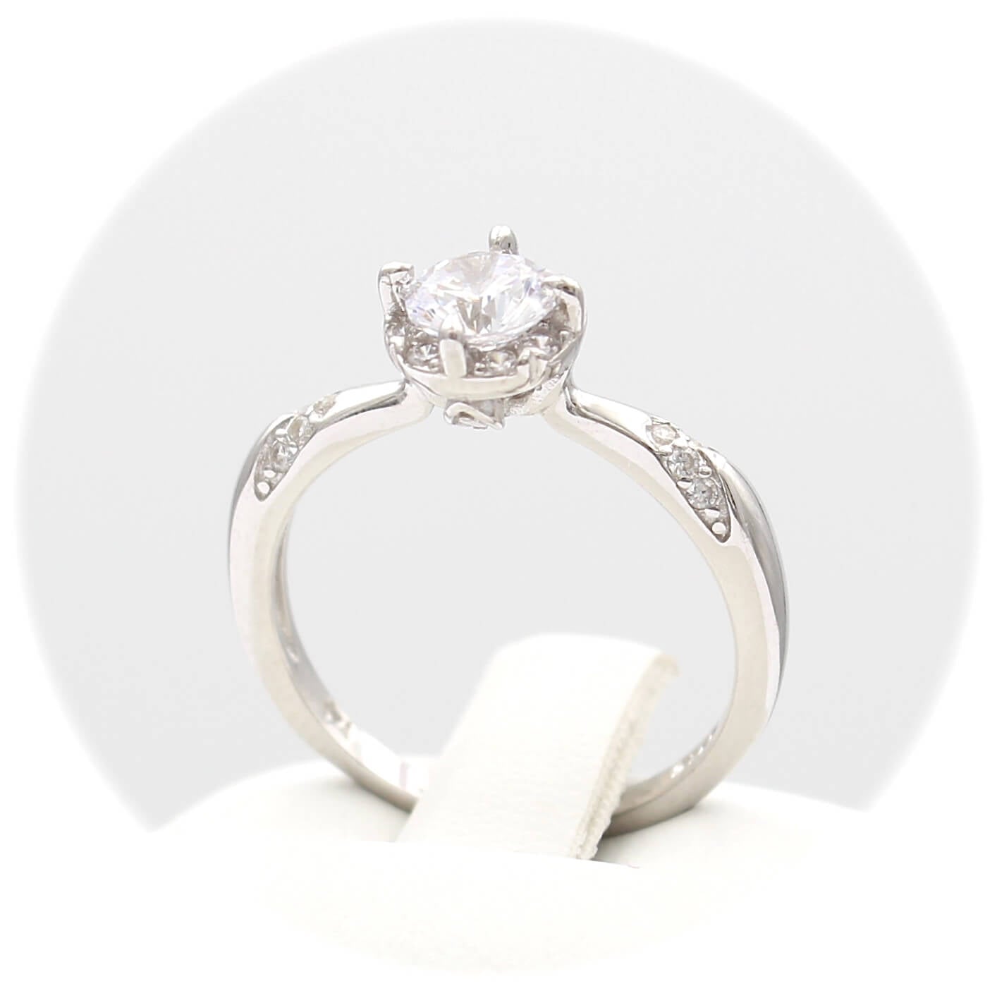 Το δαχτυλίδι είναι διακοσμημένο από κεντρική και πλευρικές λευκές πέτρες ζιργκόν