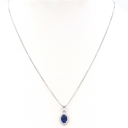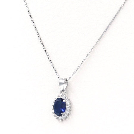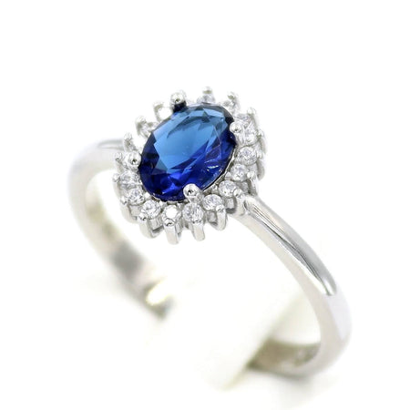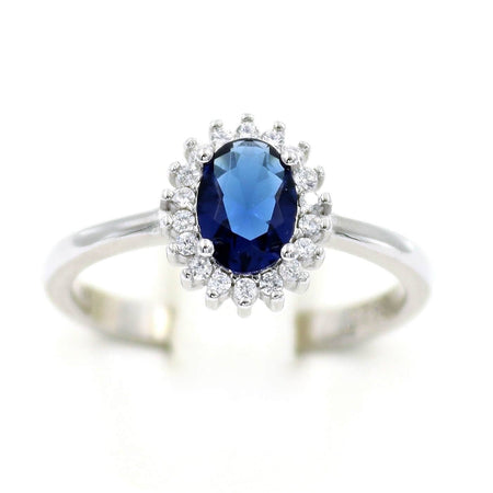 Ασημένια επιπλατινωμένα σκουλαρίκια ροζέτες σε οβάλ σχήμα, με σκούρα μπλε κεντρική και λευκές πέτρες ζιργκόν στην περιφέρεια.