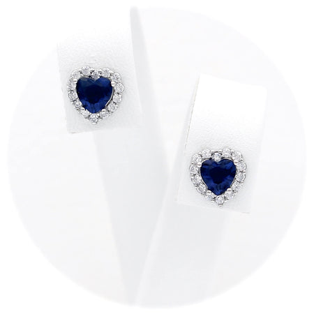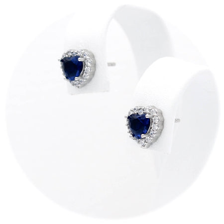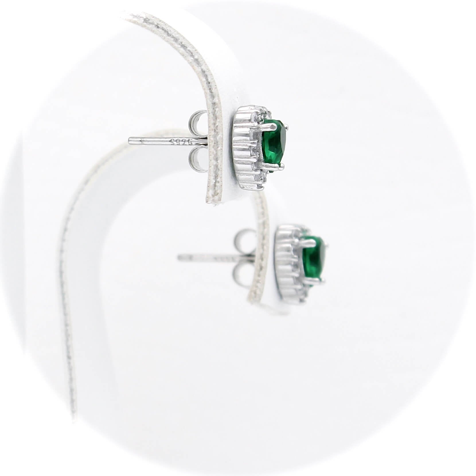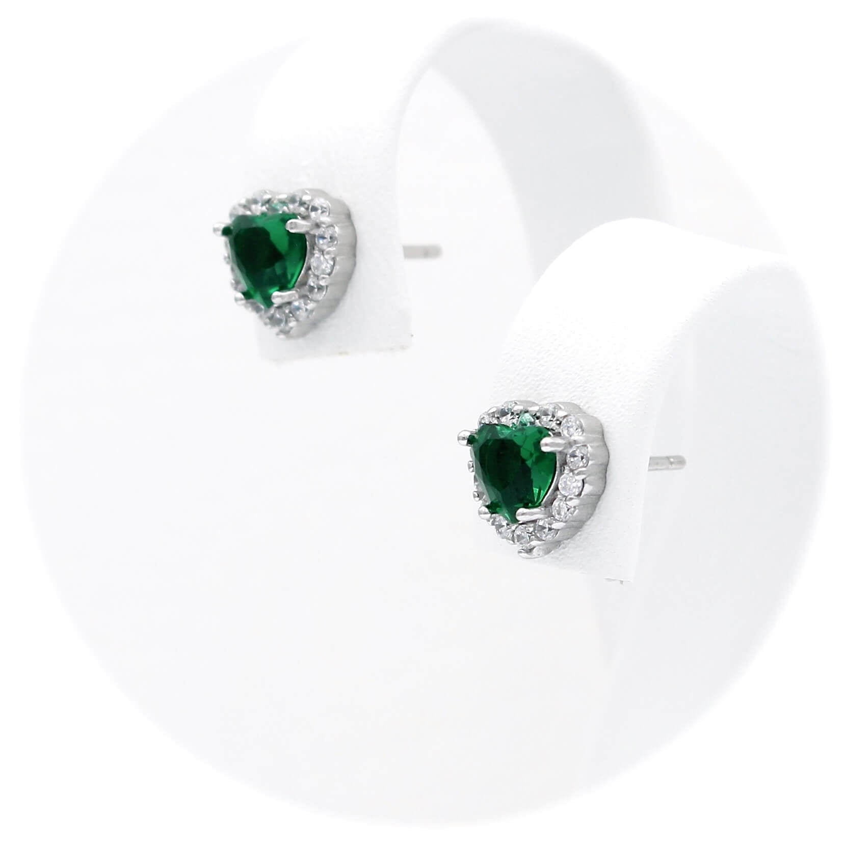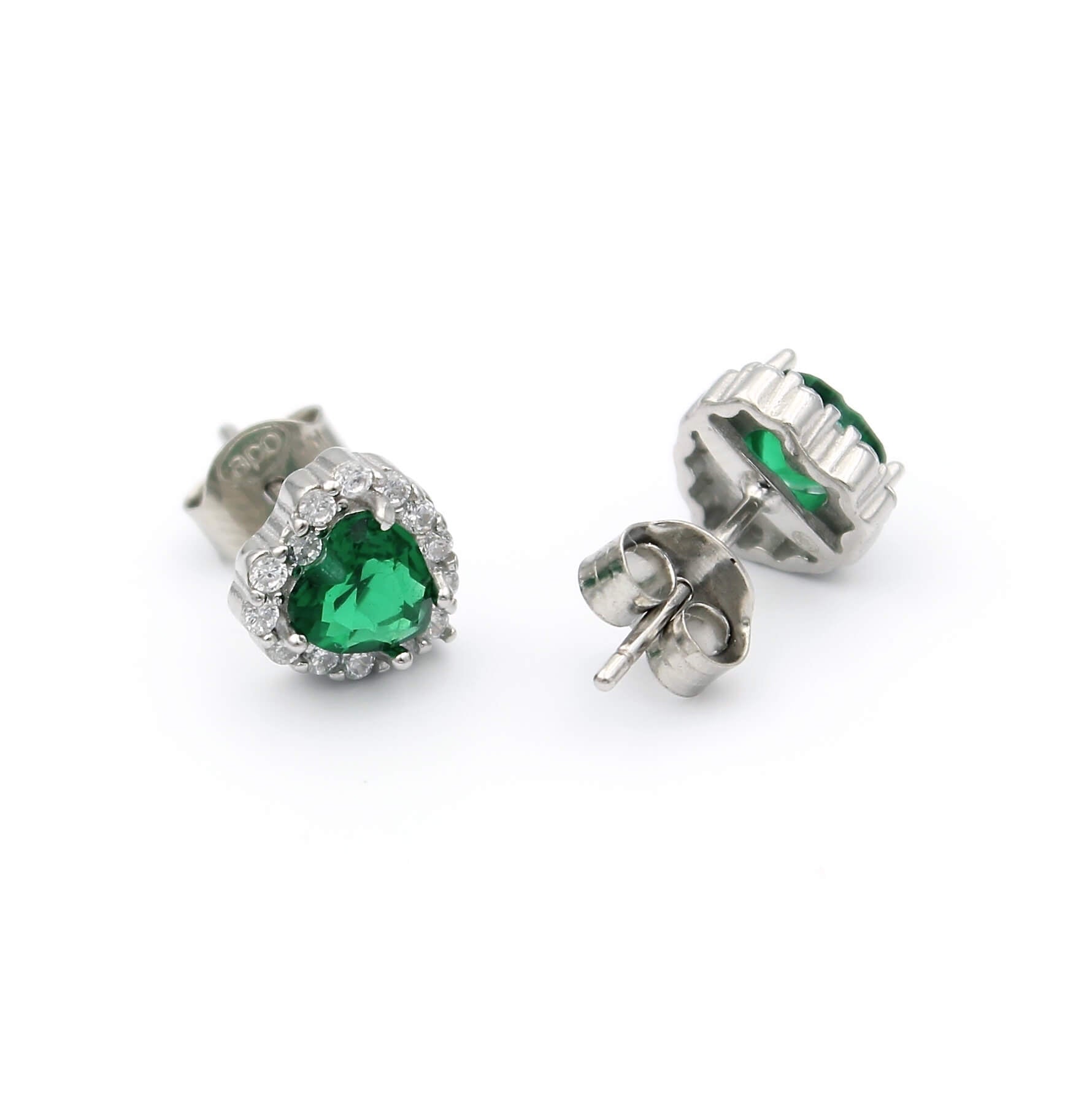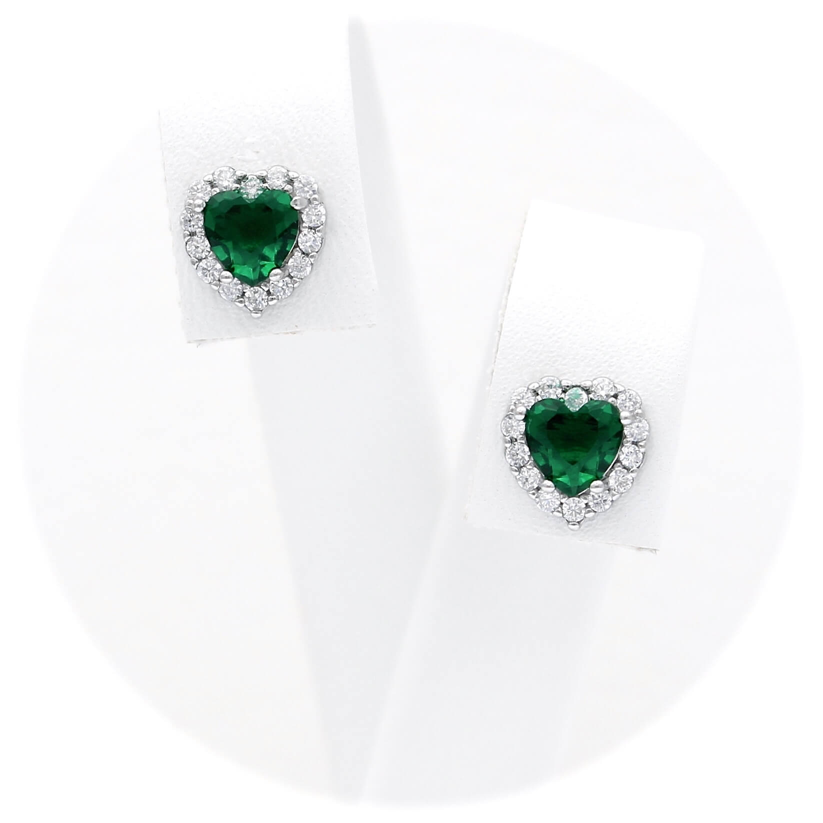 Ασημένια επιπλατινωμένα σκουλαρίκια ροζέτες σε σχήμα καρδιάς, με πράσινες κεντρικές και λευκές πέτρες ζιργκόν στην περιφέρεια.