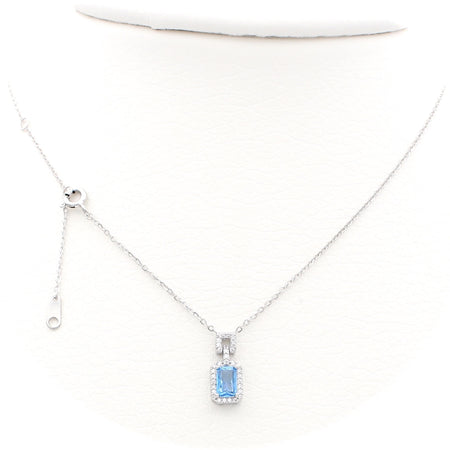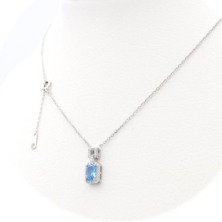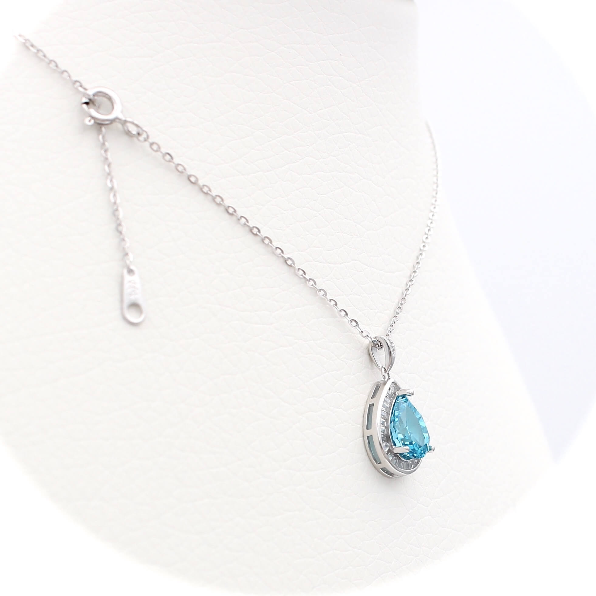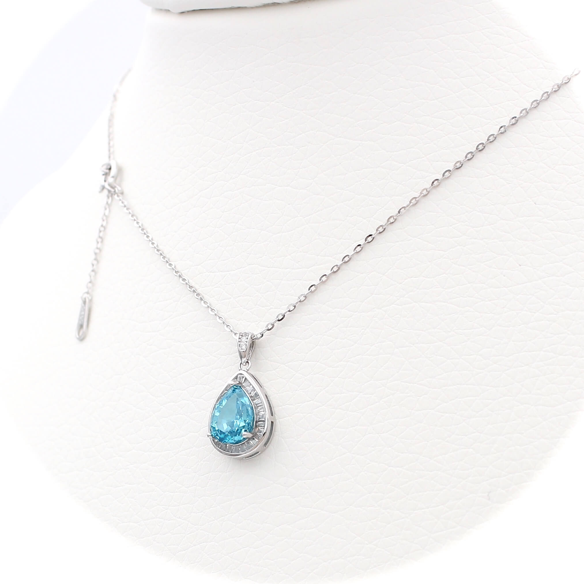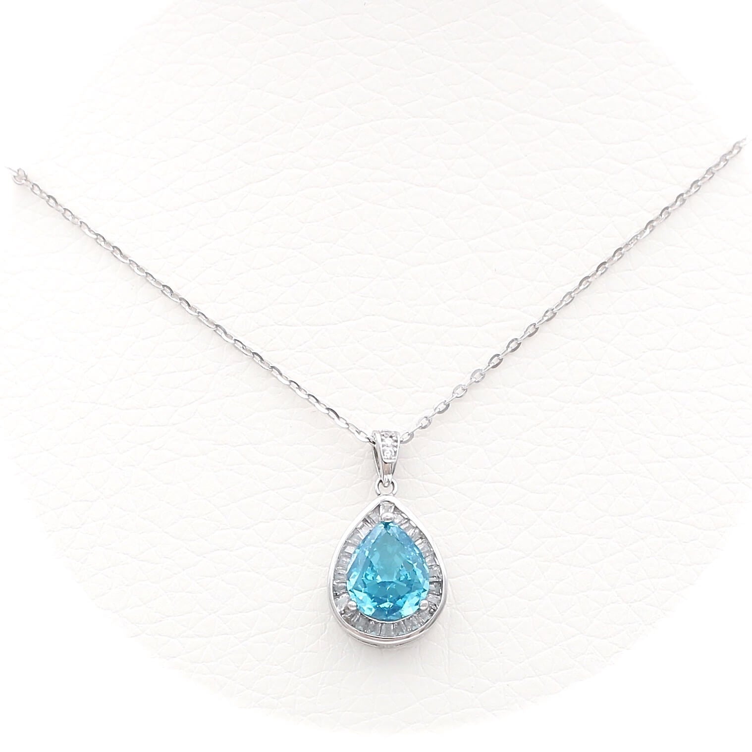 Το κολιέ είναι διακοσμημένο από μπλε κεντρική και λευκές πέτρες ζιργκόν στην περιφέρεια.