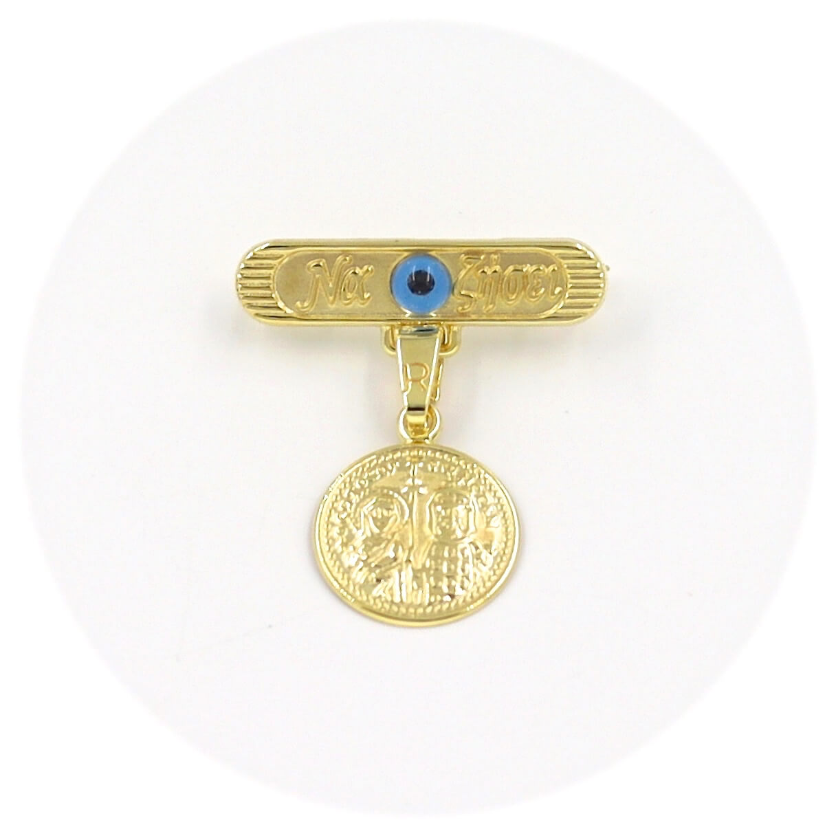 Χρυσή παραμάνα "Να Ζήσει" 9 καρατίων με μάτι σε μπλε χρώμα και φυλαχτό κωνσταντινάτο