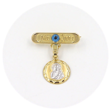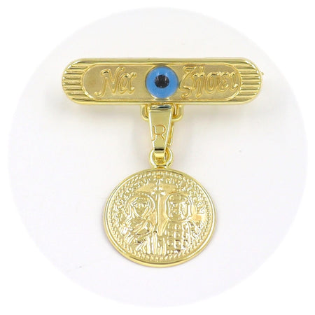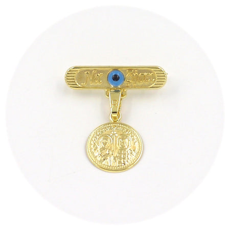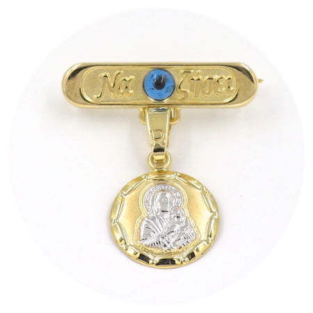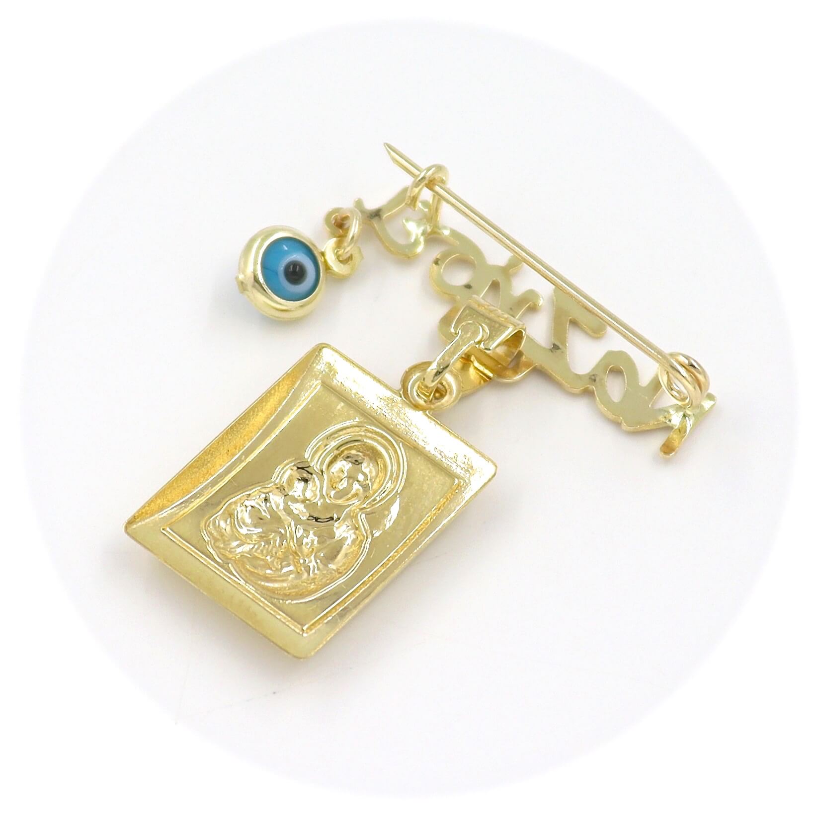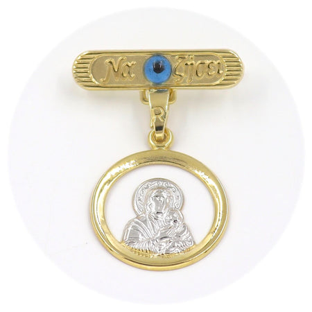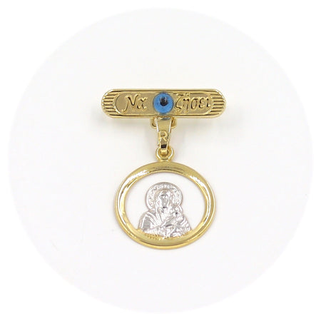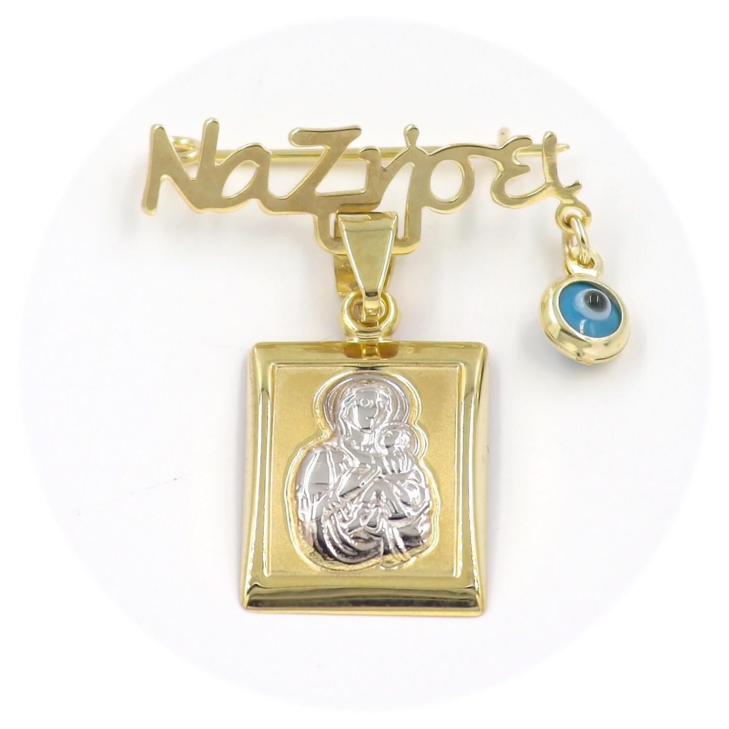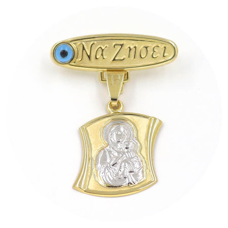 Χρυσή παραμάνα "Να Ζήσει" 9 καρατίων με μάτι σε μπλε χρώμα και δίχρωμο φυλαχτό Παναγίτσα