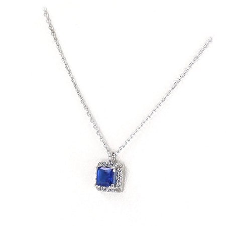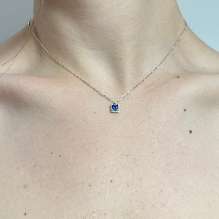 Χρυσό κολιέ 14 καρατίων ροζέτα σε καρέ σχήμα, με πράσινη κεντρική πέτρα και περιφερειακά λευκά ζιργκόν.