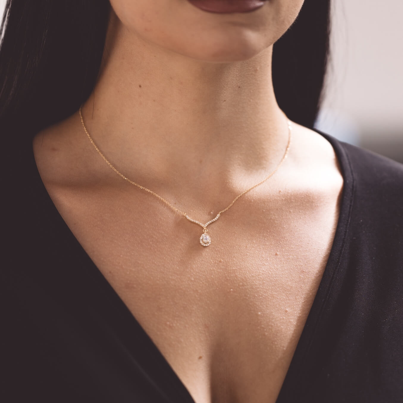 Το κολιέ είναι διακοσμημένο από λευκές πέτρες ζιργκόν