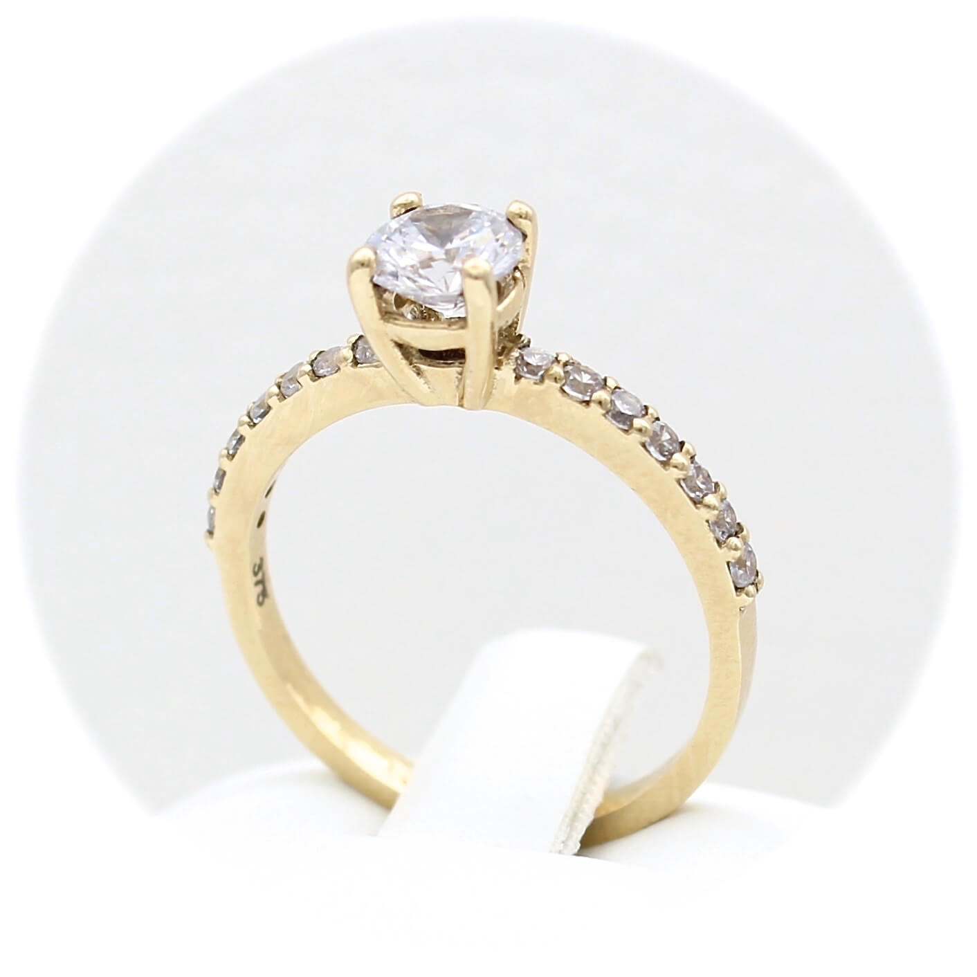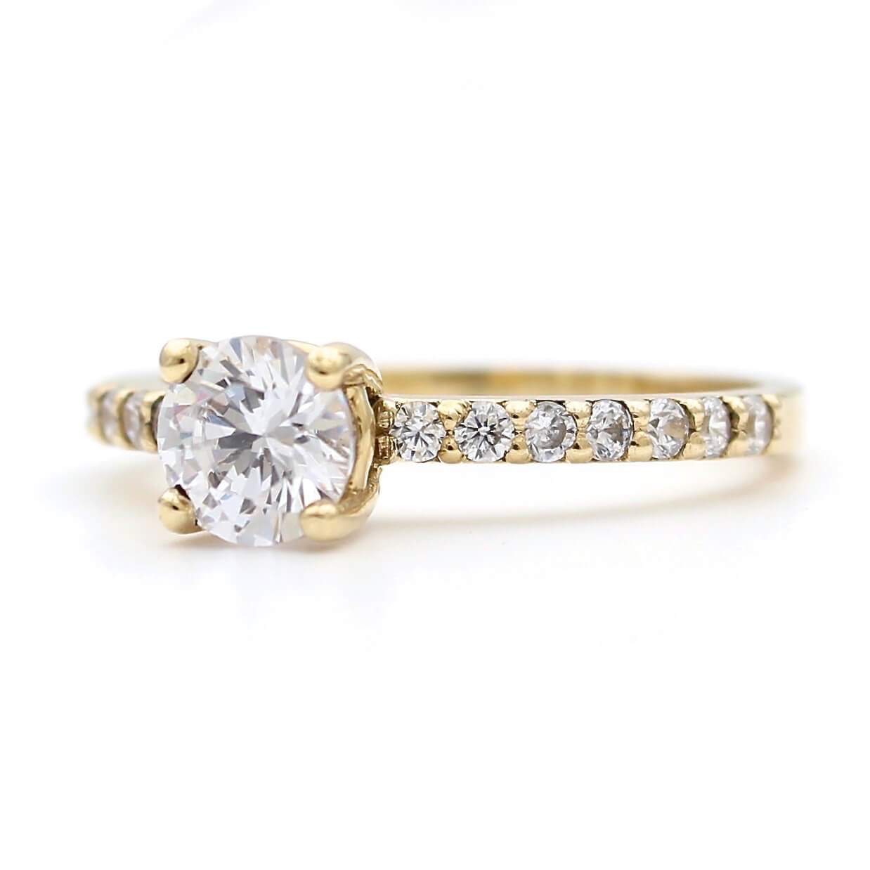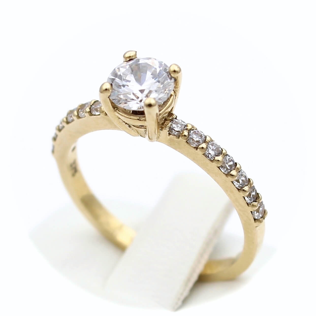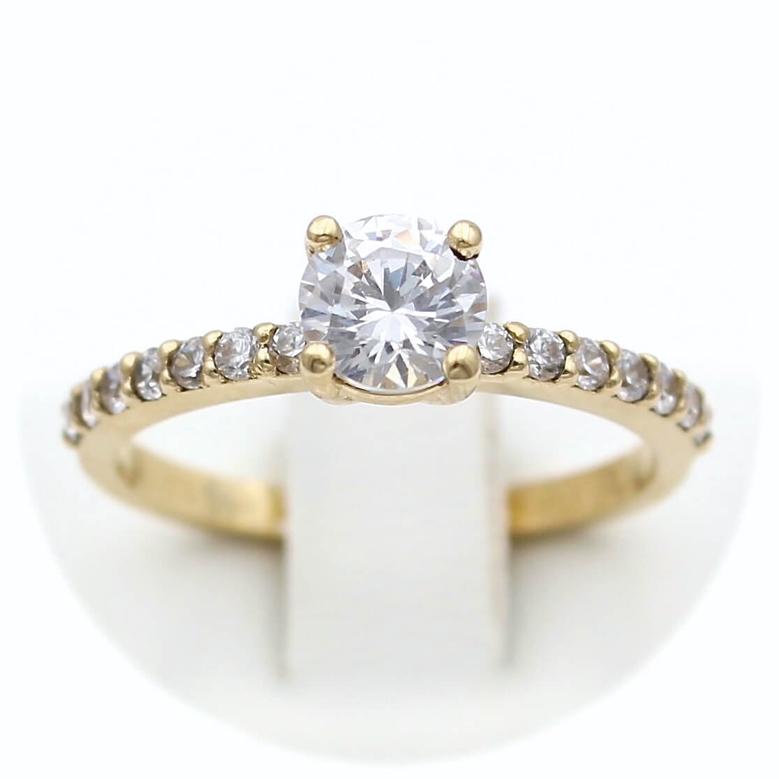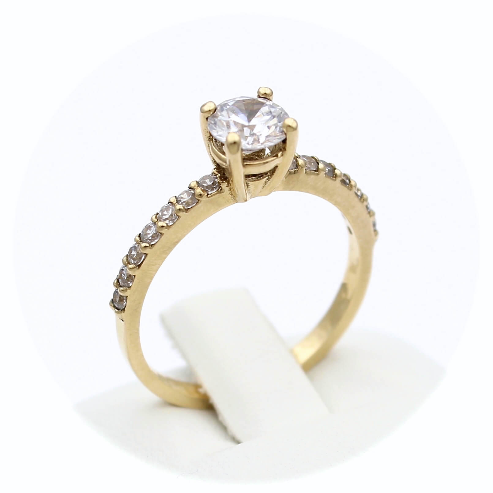 Χρυσό μονόπετρο δαχτυλίδι 9 καρατίων με κεντρική και πλευρικές λευκές πέτρες ζιργκόν