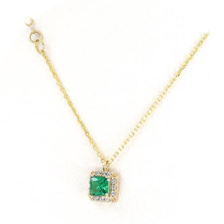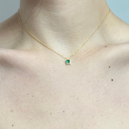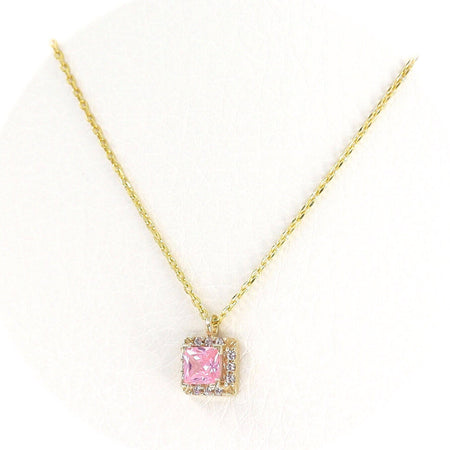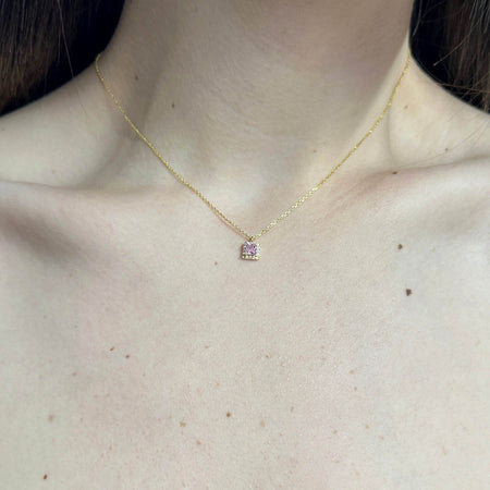 Λευκόχρυσο κολιέ 14 καρατίων ροζέτα σε καρέ σχήμα, με σκούρα μπλε κεντρική και περιφερειακά λευκά ζιργκόν.